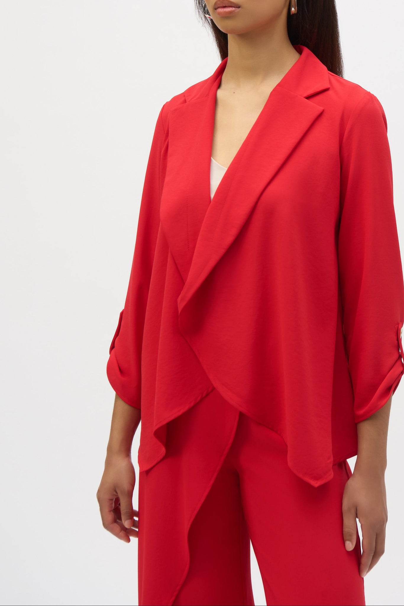 Command attention in our eggshell open blazer, featuring a sleek notched collar and a cascading front draping the garment with simple elegance. The three-quarter sleeves, finished with a tab and button detail, add a polished feel to this wardrobe essential. Perfect for layering, this blazer encapsulates timeless chic with a contemporary twist.