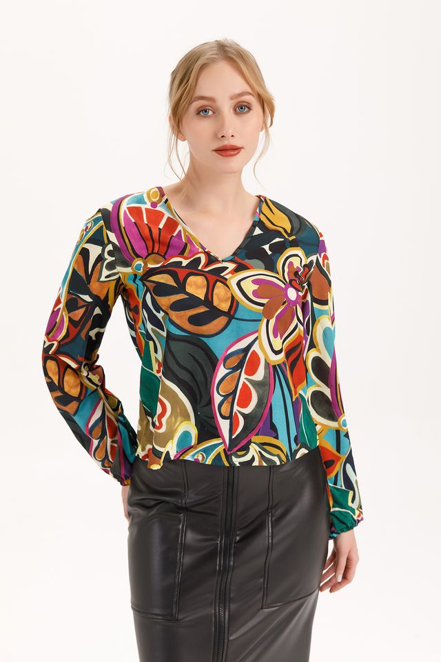 Elevate your style with the Majorca Long Sleeve V-Neck Blouse, featuring a unique leaf print that adds a touch of nature-inspired charm. Its long sleeves offer light coverage, making it perfect for transitioning seasons. The blouse bursts with rich, saturated colors that brighten any outfit and mood alike. Playful yet polished, it's your new go-to for effortless elegance with a lively twist.