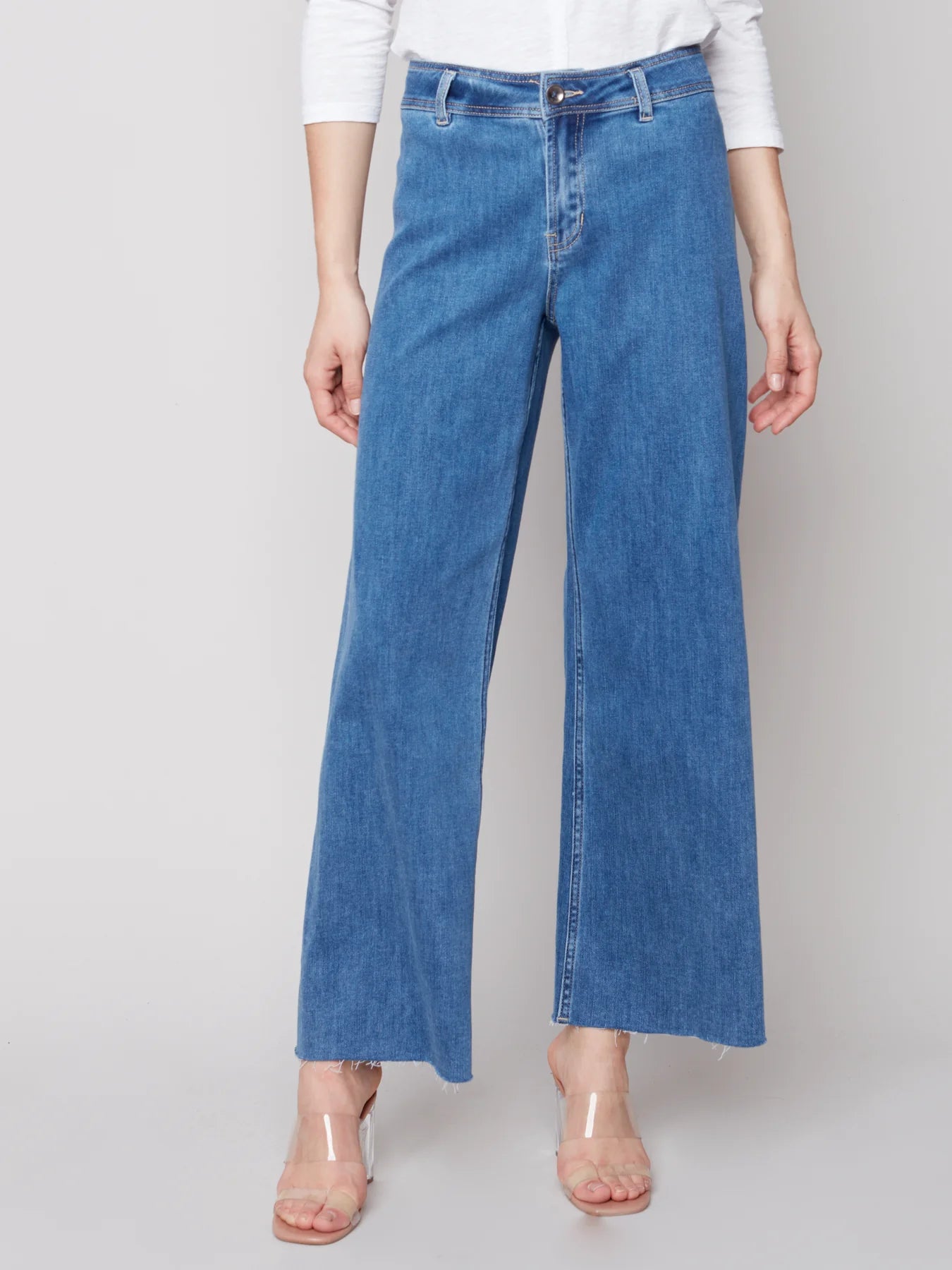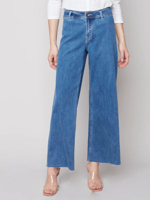Make the wide leg jeans look your own by styling these raw edge denim pants your way. Tuck in your favorite sleeveless blouse or T-shirt, and try it with a light sweater for a fashion-forward spring and summer look you’ll love. Get yours in a Medium Blue wash today!